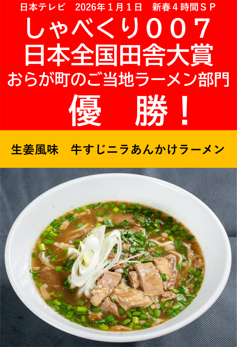 ・日本テレビ【しゃべくり007・新春4時間SP】で(おらが町のご当地ラーメン部門・優勝)の「生姜風味 牛すじニラあんかけラーメン」あります。